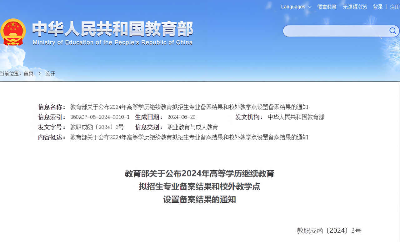 教育部关于公布2024年高等学历继续教育拟招生专业备案结果和校外教学点设置备案结果的通知