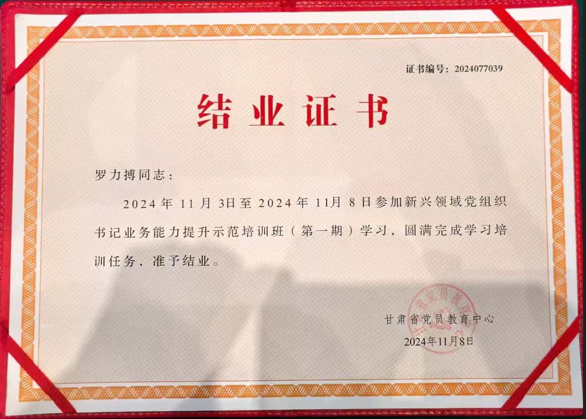 甘肃华远教育专修学院院长、甘肃华远职业培训学校校长、兰州人才交流与培训协会会长、党支部书记罗力搏参加全省新兴领域党组书记业务能力提升示范培训班(第一期)。此次培训班由中共省委组织部、中共甘肃省委社会工作部等部门联合主办。
