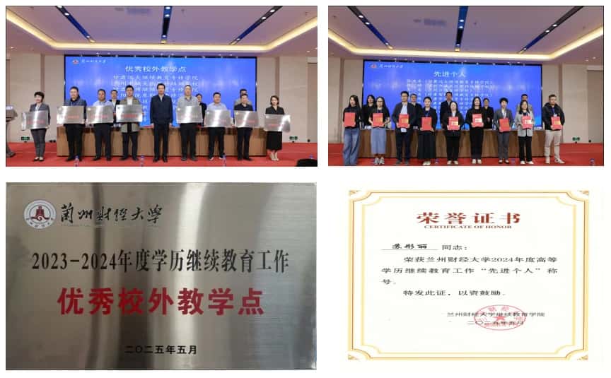 我院被评为2023-2024年度学历继续教育工作“优秀校外教学点”,我院教务主任苏彤丽被评为兰州财经大学2024年度高等学历继续教育工作“先进个人”称号。