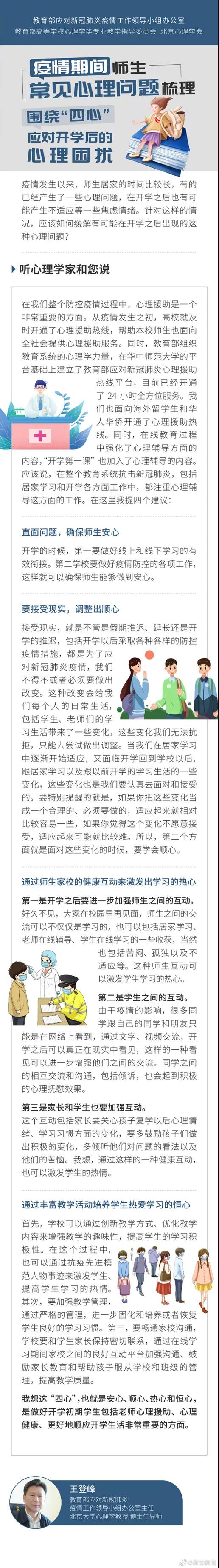 疫情发生以来,师生居家的时间比较长,开学后也可能会产生不适应的焦虑情绪。针对这种情况,该如何缓解有可能在开学后出现的这种心理问题?一起来听教育部应对新冠肺炎疫情工作领导小组办公室主任王登峰的讲解↓↓