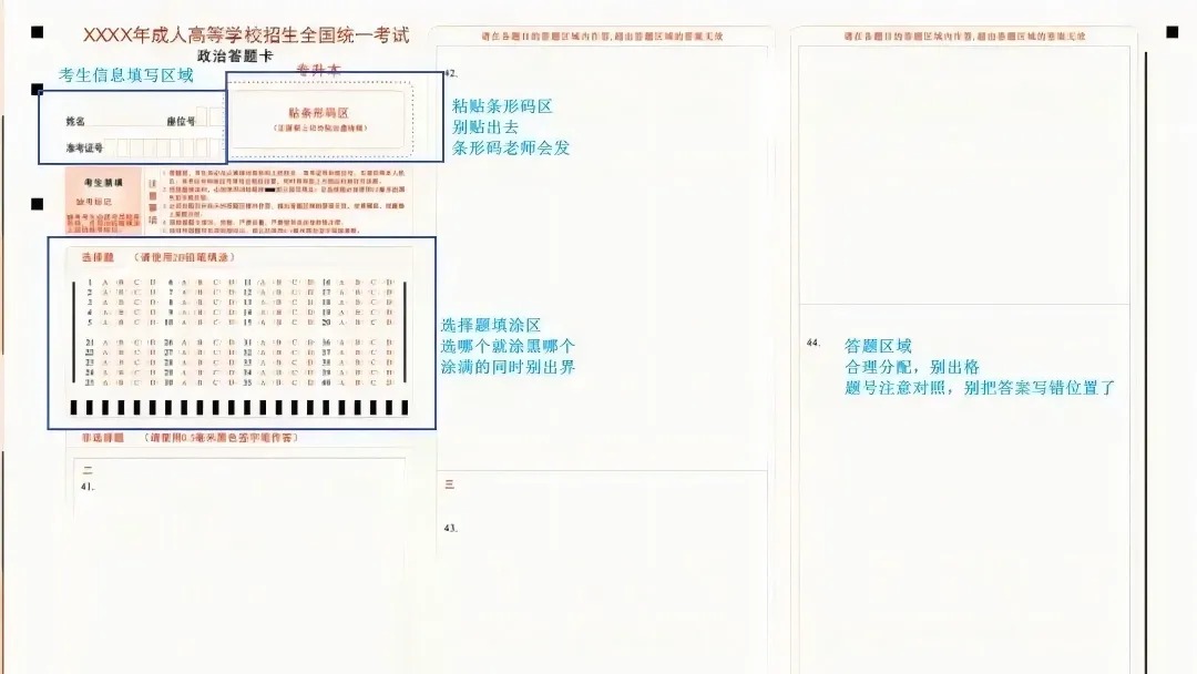 以专科起点答题卡为例,依次为:标题及考生信息填写区——选择题答题区——非选择题答题区——座位号填涂区。