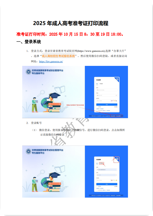 2025年甘肃省成人高考将于本周10月18日(星期六)-19日(星期日)进行,现将准考证打印事项通知如下: