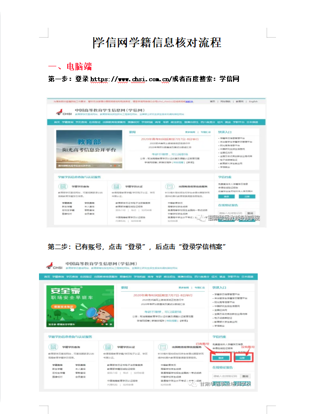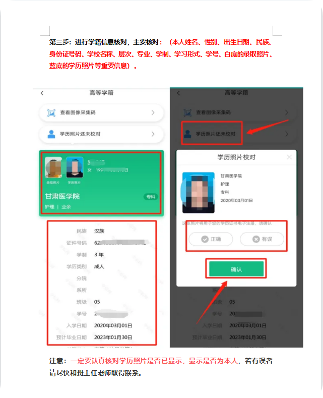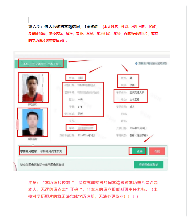 大家好,接甘肃农业大学通知,为确保毕业生学历证书信息的准确性、规范性,保障毕业生学历电子注册工作的顺利进行,现将毕业生信息核对工作有关事项通知如下:现需各位同学登录自己的学信网,核查学信网学籍信息,特别是姓名、性别、民族、出生日期、身份证号码、学校名称、学号、层次、专业、学习形式(函授)、白底的录取照片、蓝底的学历照片等信息。(后附流程)