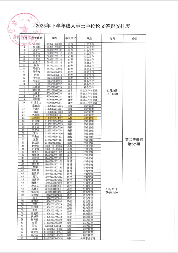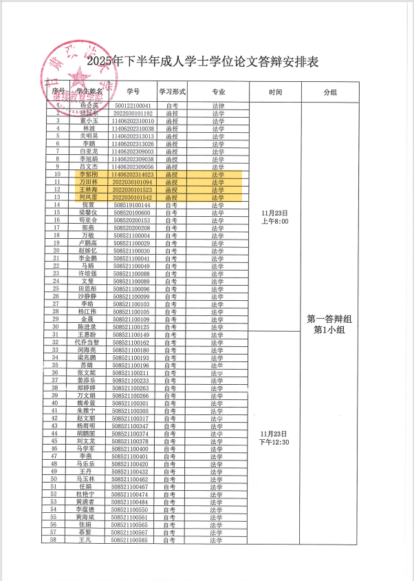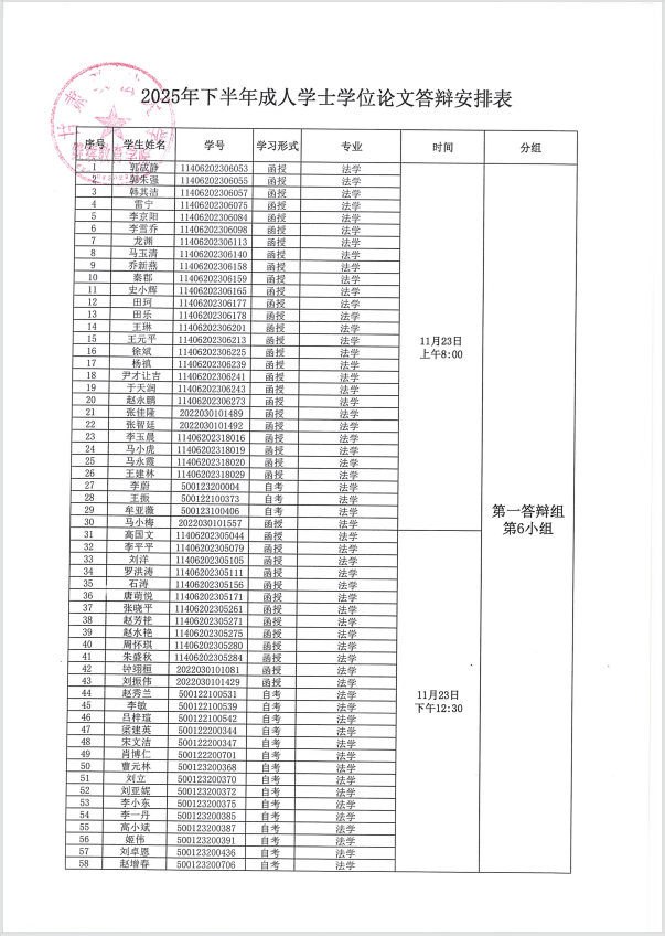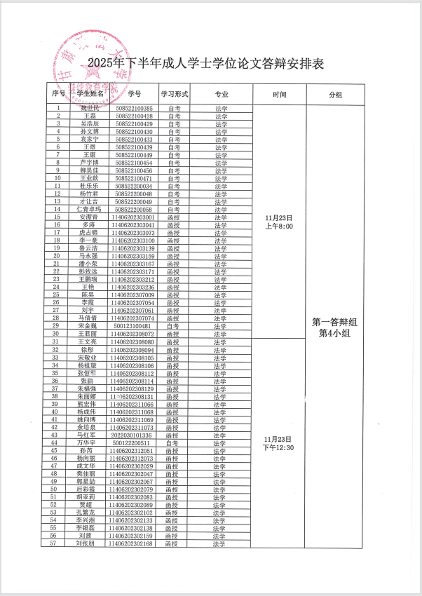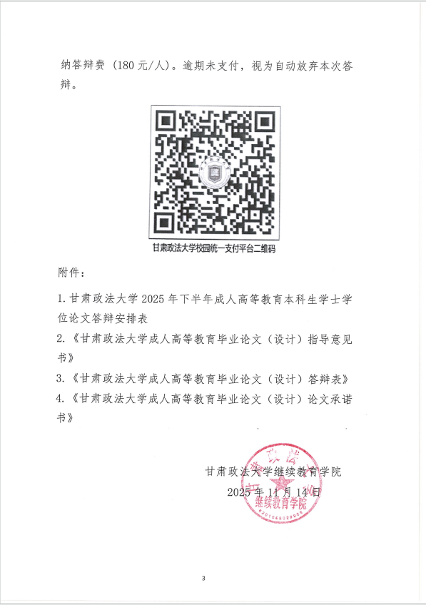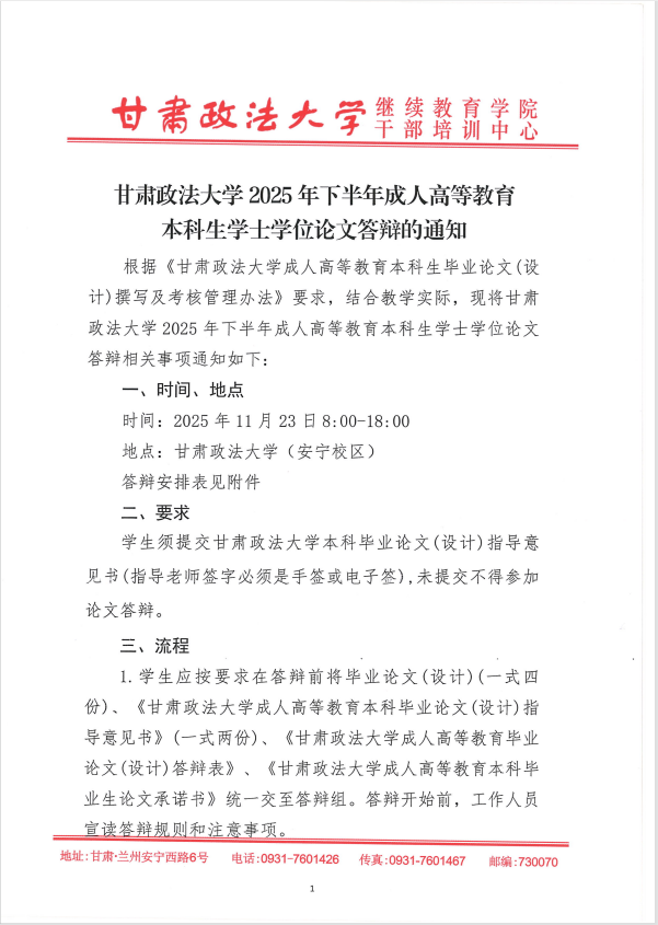 大家好,接甘肃政法大学通知,根据《甘肃政法大学成人高等教育本科生毕业论文(设计)撰写及考核管理办法》要求,结合教学实际,现将甘肃政法大学2025年下半年成人高等教育本科生学士学位论文答辩相关事项通知如下: