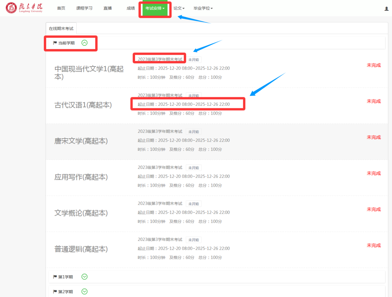 2025年12月20日08:00-12月26日22:00,每门课程考试时长为100分钟;