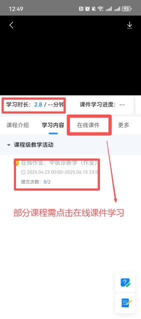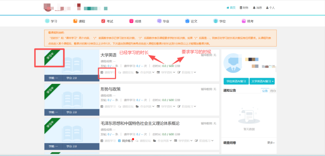登录电脑端平台后,首页显示每学期的课程,如没有当前学期课程,则学校还没有开课。点击“课程学习”进行学习;课程栏中“/”右侧表示需要完成的要求,左侧是实际完成的进度;“学习中”表示此门课程,本学期正在学习中或者为之前学期未通过的课程,课程通过显示已结束。线上考试,可在考试模块中参加。