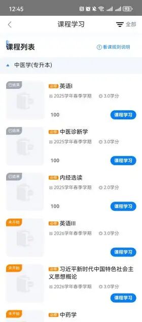 下载完成后,登录App进入首页,选择功能模块,看课选择“课程学习”,考试选择“在线考试”等;进入课程学习中,课程列表中显示当前学期与之前学期课程,已结束表示课程通过,未开始表示课程还未开课。学习中表示此门课程本学期正在学习中或者为之前学期未通过的课程,若有作业在学习内容中查看;线上考试从首页进入“在线考试”模块进行答卷。