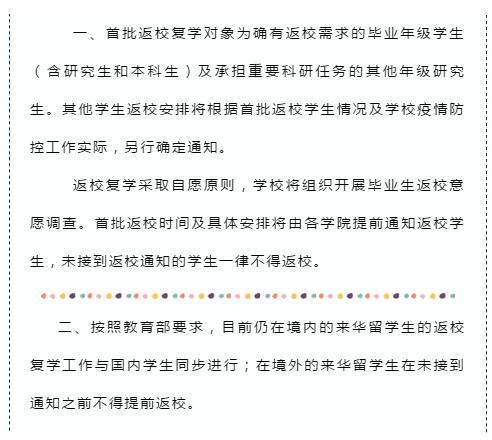 首批返校复学对象为确有返校需求的毕业年级学生(含研究生、本科生),具体返校时间和有关要求由各学院通知每位学生。其他年级学生返校时间,学校将根据疫情防控和工作实际另行通知。未接到返校通知的学生暂不返校。