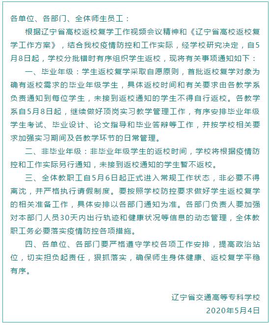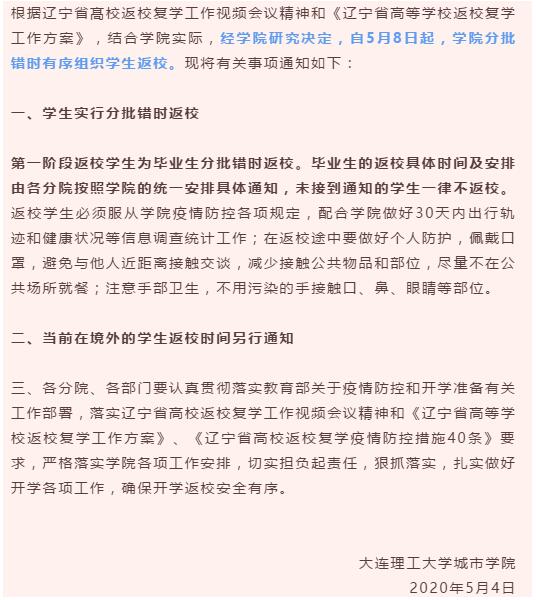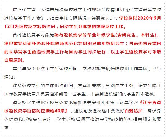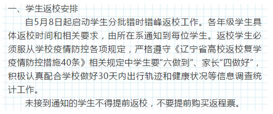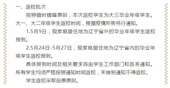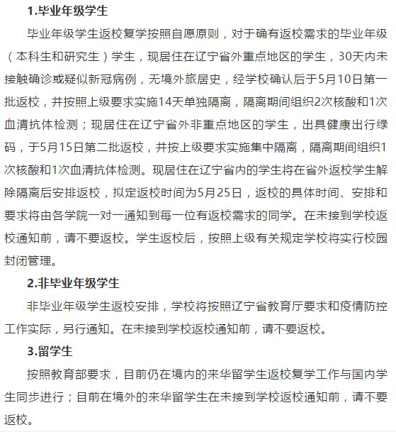 自5月18日(星期一)起学校将按先省外后省内、先毕业年级后其他年级的原则分批错时组织学生有序返校,学生返校复学按照自愿原则。1.毕业年级学生确有返校需求的毕业年级(本科生和研究生)学生,省外(现居住在辽宁省外)学生于5月18日(星期一)先行返校,并按上级要求做好隔离工作和医学检测;省内(现居住在辽宁省内)学生在省外返校学生解除隔离后安排返校,具体时间另行通知。返校的具体时间、安排和要求将由各学院和研究生培养单位通知到每一位同学。2.非毕业年级学生(1)承担重要科研任务并自愿返校的非毕业年级研究生,省外(现居住在辽宁省外)研究生于5月18日(星期一)先行返校,并按上级要求做好隔离工作和医学检测;承担重要科研任务并自愿返校的省内(现居住在辽宁省内)研究生在省外返校研究生解除隔离后安排返校,具体时间另行通知。返校的具体时间、安排和要求将由各学院和研究生培养单位通知到每一位研究生。(2)其他非毕业年级学生(本科生和研究生)返校安排,学校将按照辽宁省教育厅要求和疫情防控工作实际,另行通知。在未接到学校返校通知前,不得提前返校。3.留学生按照教育部要求,目前仍在境内的来华留学生返校复学工作与国内学生同步进行;目前在境外的来华留学生在未接到学校返校通知前,不得提前返校。