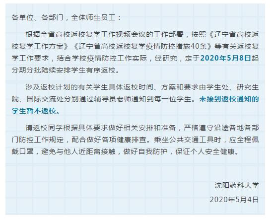 学校组织已经完成毕业答辩且居住在辽宁省内的毕业研究生于5月14日、15日两天先行返校办理离校手续;对确有返校需求的其他毕业年级学生,自5月22日起,分批错时有序组织返校,省外学生须按上级要求做好隔离工作和医学检测,各类学生返校具体时间及安排由所在学院具体通知。