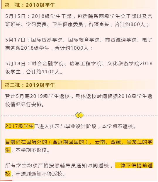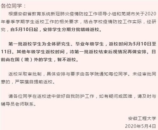 自5月10日起学校将按先省外后省内、先毕业年级后其他年级原则组织学生分批错时有序返校。