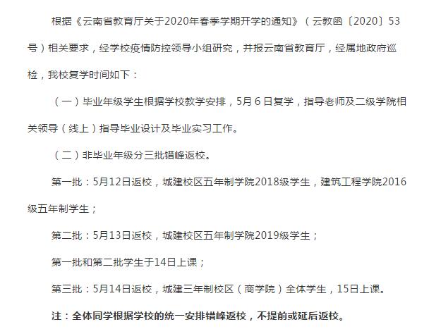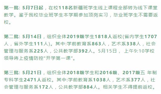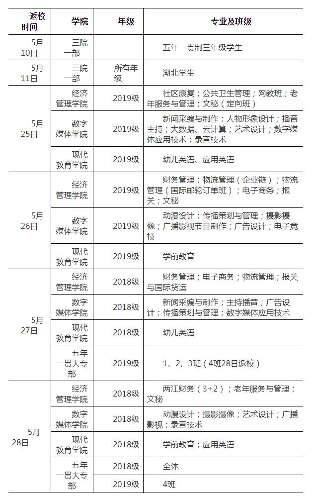 自5月10日起,按照先省外后省内、先毕业年级后其他年级的原则,分批错峰有序启动返校复学工作。