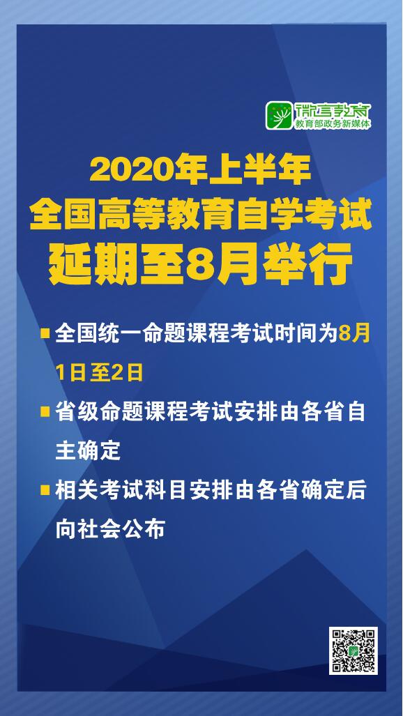 根据党中央、国务院关于新冠肺炎疫情防控工作的有关精神,经研究,原定于2020年4月11日至12日举行的全国高等教育自学考试延期至8月举行。全国统一命题课程考试时间为8月1日至2日,省级命题课程考试安排由各省自主确定,相关考试科目安排由各省确定后向社会公布。