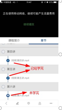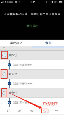 软件支持离线学习,如果视频比较大可在下图中对应的界面点击对应的章节,进行缓存即可。可以将视频缓存到本地,且学习记录与PC端保持一致。