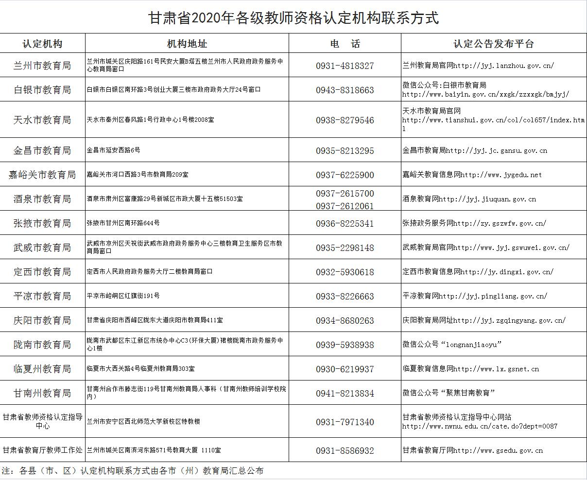 (三)申请人应如实提交相关材料,故意弄虚作假,骗取教师资格的将依据国家有关规定进行处罚。附件:甘肃省2020年各级教师资格认定机构联系方式