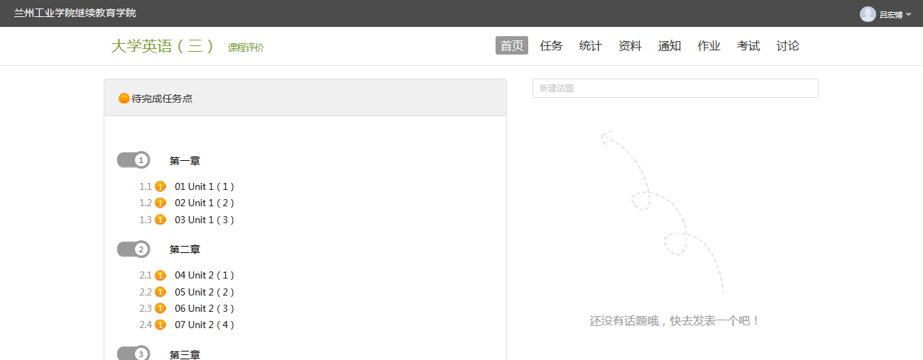 C、点击学习空间的课程,即可进入每门课程的学习空间。如图下所示:学习空间界面可显示学习进度和未完成任务点数。