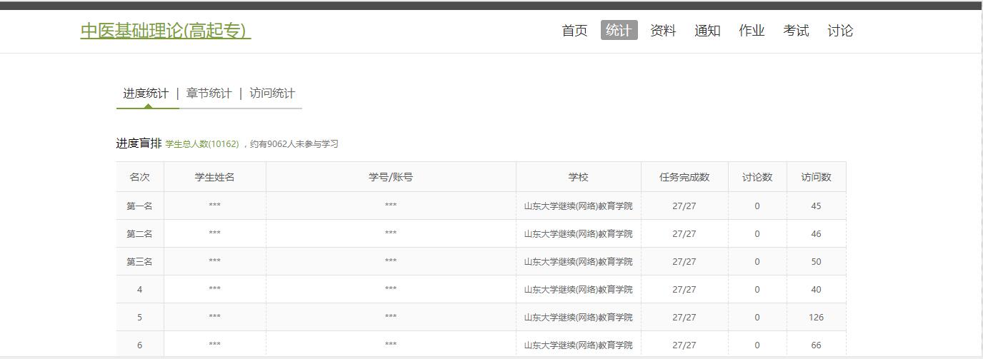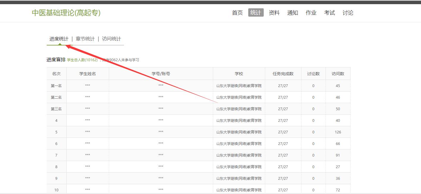 在右上角导航栏中点击统计即可进入统计界面,学生在统计页面可查看自己的学习进度情况。