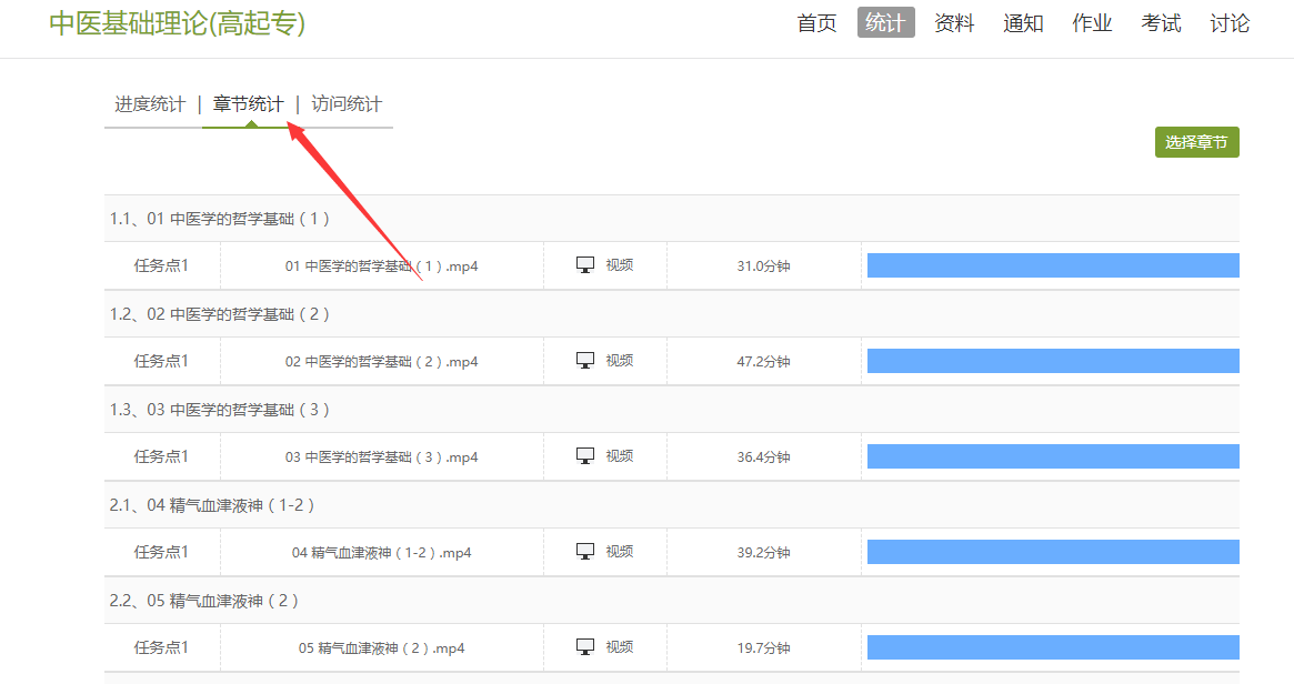 点击章节统计,显示界面如下图,学生通过章节统计可直观的得到学习进度的章节信息以及任务点完成数。可以通过右上角下拉菜单选择章节。