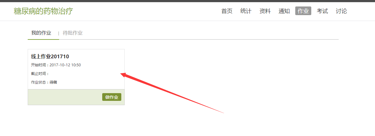 在课程空间内,点击右上角导航栏作业,进入作业页面后显示我的作业,点击作业即可做作业。