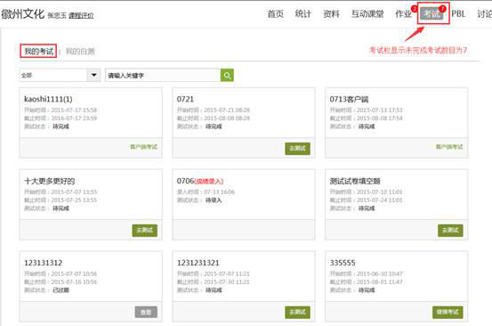 在课程空间内,点击导航栏的考试,进入考试界面,如图所示