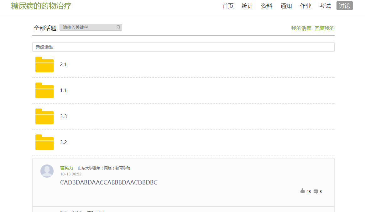 在课程空间的导航栏中点击讨论,即可进入讨论界面,学生可以在任何章节新建讨论话题,也可以在已有话题中点击回复参与讨论,老师可以对学生谈论内容加精处理,加精后的讨论显示为精华,以便学生筛选查看。除此之外,还有问答,我发表的和我回复的三个筛选条件。