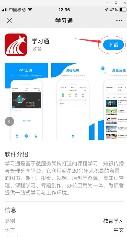 第二步:出现超星APP下载页面(注意此页面苹果和安卓的手机都是一样的),然后点击下载按钮