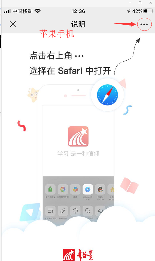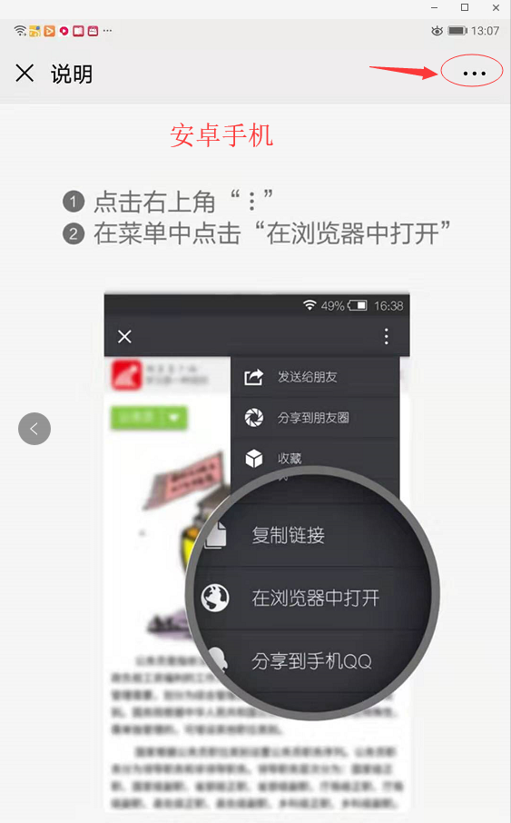 第三步:按照指示,点击右上角的…图标,选择在浏览器中打开,此时请注意,苹果手机要选择“在safari中打开”,安卓手机请任意选择一个浏览器。
