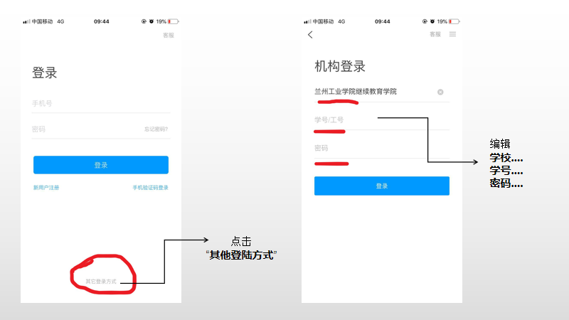 不要注册新用户或用手机号码登录,一定要选择其它方式登录,这个很重要,如果你直接注册账号或用手机号登录,那么系统无法知道你是哪个学校的学生,因为全国有很多学校都在用学习通,所以你必须选择其它方式登录,用学号和密码登录。