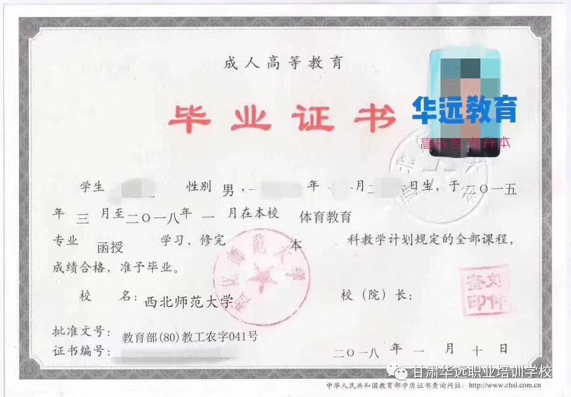学生按教学计划完成规定课程的学习,考试成绩合格,颁发教育部统一印制的西北师范大学成人高等教育本(专)科毕业证书(实行国家电子注册),国家承认其学历。