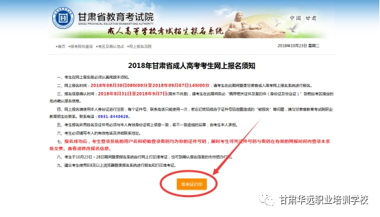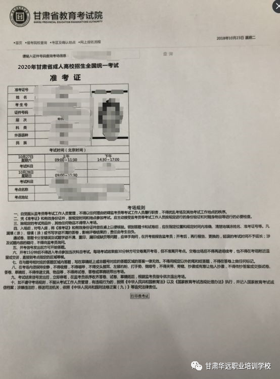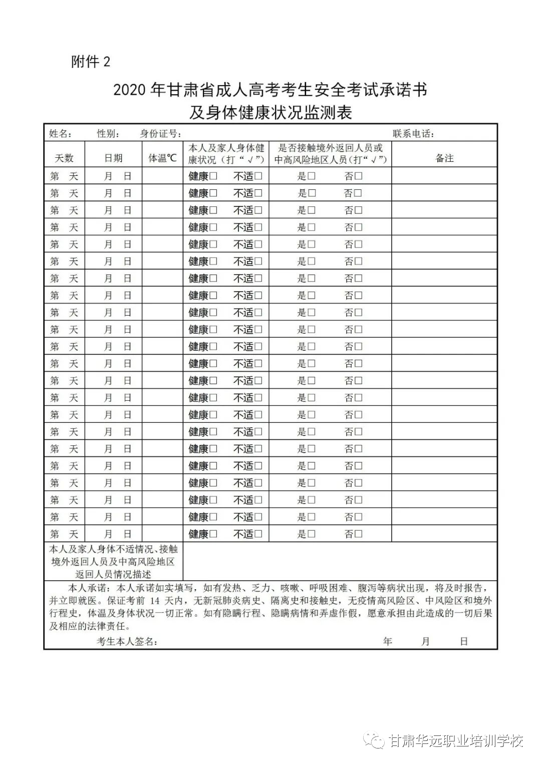 五、10月21日起,考生登录甘肃省教育考试院网站自行打印准考证(具体打印流程见第八条)。同时打印《2020年甘肃省成人高考考生安全考试承诺书及身体健康状况监测表》(见附件2),并签字确认,于第一场考试时交监考人员。