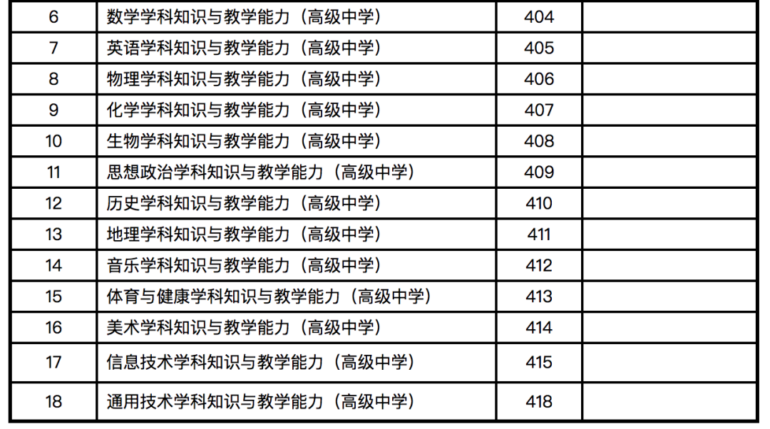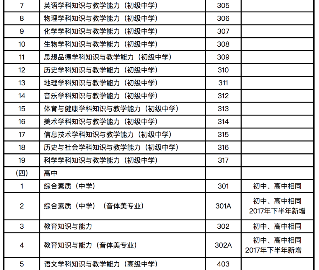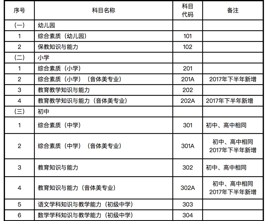 1.为完善中小学教师资格考试制度设置,加强中小学音、体、美专业教师队伍建设,从2017年下半年考试开始,对音、体、美专业考生的笔试公共科目一、科目二(科目代码:201、202、301、302)实行单独编码(相应科目代码:201A、202A、301A、302A),考试内容暂与原科目相同。实行单独编码后,音、体、美专业考生在笔试报名时应选报单独编码的公共科目。取得科目201A、202A合格的考生,面试仅限于参加小学类别音、体、美专业科目;取得科目301A、302A合格的考生,面试仅限于参加初中、高中、中职文化课音、体、美专业科目。考生已获得科目201、202、301、302合格成绩,可相应替代科目201A、202A、301A、302A合格成绩;考生已获得科目201A、202A、301A、302A合格成绩不可替代科目201、202、301、302合格成绩。