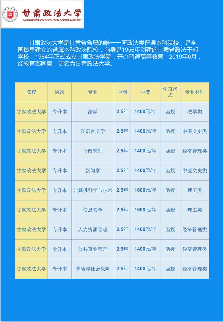 甘肃政法大学是甘肃省省属的唯一一所政法类普通本科院校,是全国最早建立的省属本科政法院校,前身是1956年创建的甘肃省政法干部学校,1984年正式成立甘肃政法学院,开办普通高等教育。学校2006年取得硕士学位授予单位资格,2007年开办硕士研究生教育,2017年开办国际生教育,同年被确定为甘肃省博士学位授予立项建设单位,是国家首批卓越法律人才教育培养基地院校、全国第二批高校实践育人创新创业教育基地”和全国政法院校“立格联盟”成员。2019年6月,经教育部同意,更名为甘肃政法大学。
