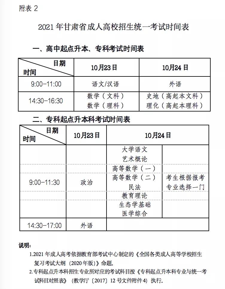 2.2021 年甘肃省成人高校招生统一考试时间表