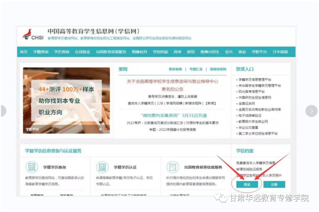 第二步:点击登录,如果没有注册过账号,请先注册一个学信网账号;