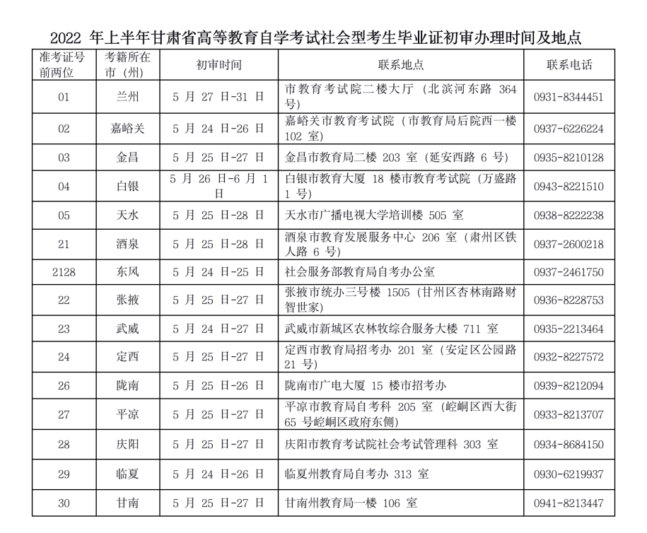 附:2022年上半年甘肃省高等教育自学考试社会型考生毕业证初审办理时间及地点。