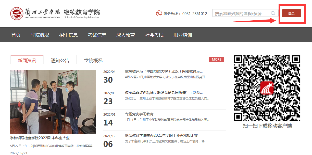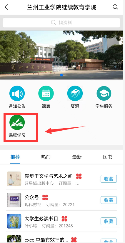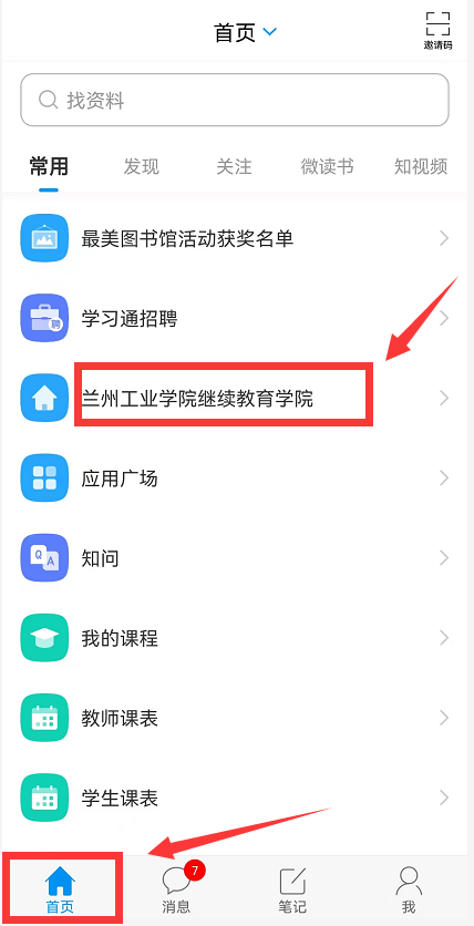 1、登录学习通APP,选择页面下方“首页”,点击“兰州工业学院继续教育学院”;