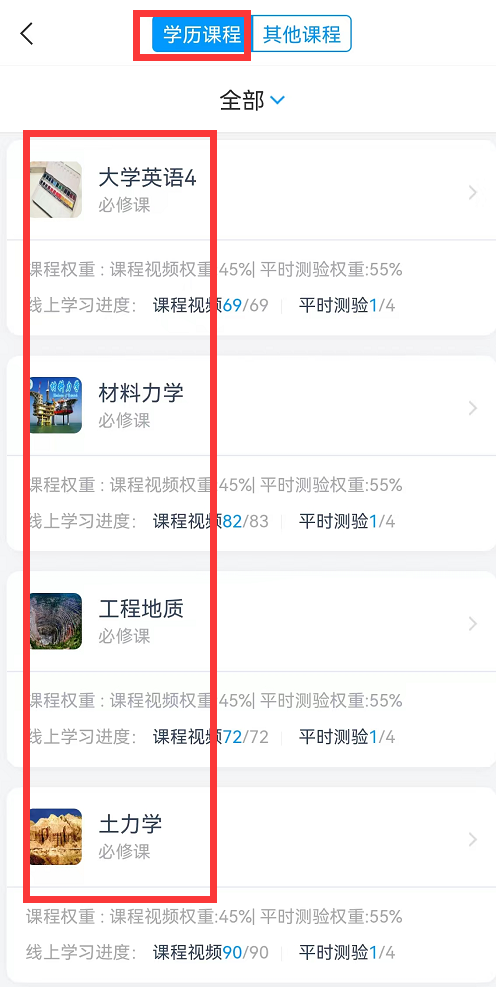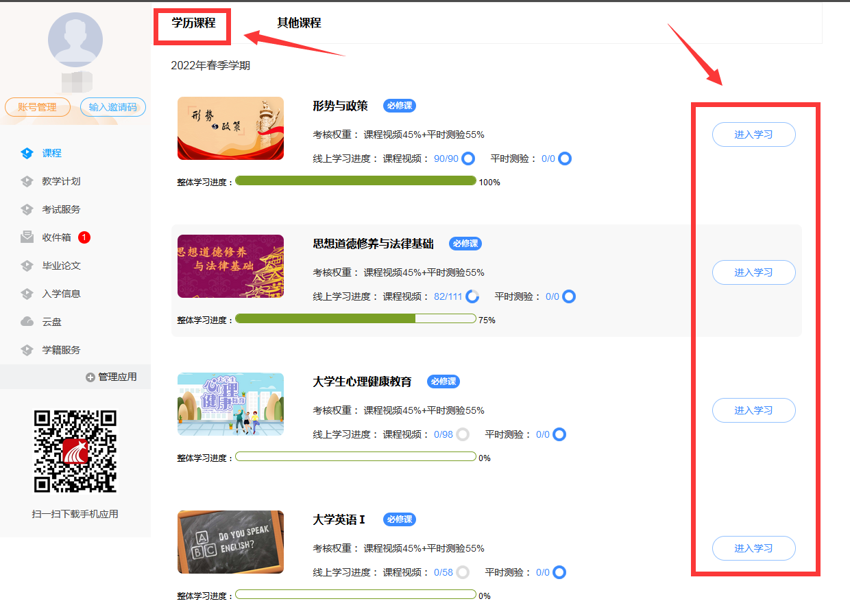 2、点击“课程学习”,完成“学历课程”列表中所有课程的考试,点击需要考试的课程;