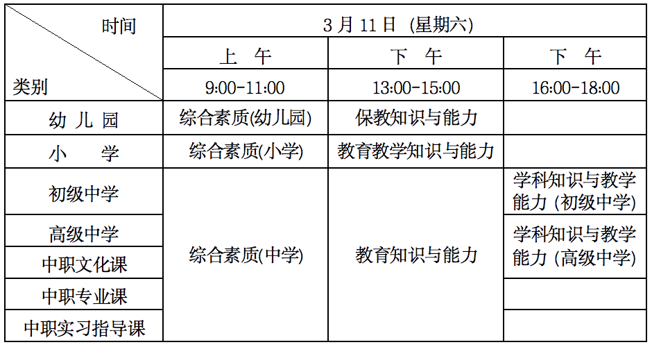 目前,NTCE开考5个学段,即幼儿园、小学、初中、高中和中职(包括文化课、专业课、实习指导课3类)。各学段设置科目见附件2。