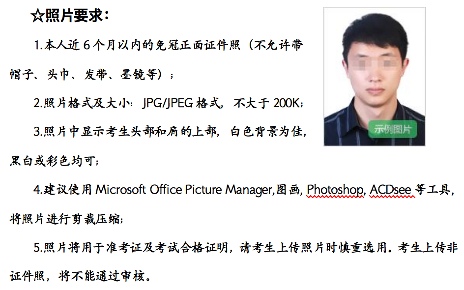 (六)所有考生笔试报名前需要重新进行注册、填报个人信息并上传个人照片,重新注册操作不影响考生已获得的成绩。注册上传照片将用于准考证和考试合格证明,请考生上传照片时遵守规范、慎重选用。