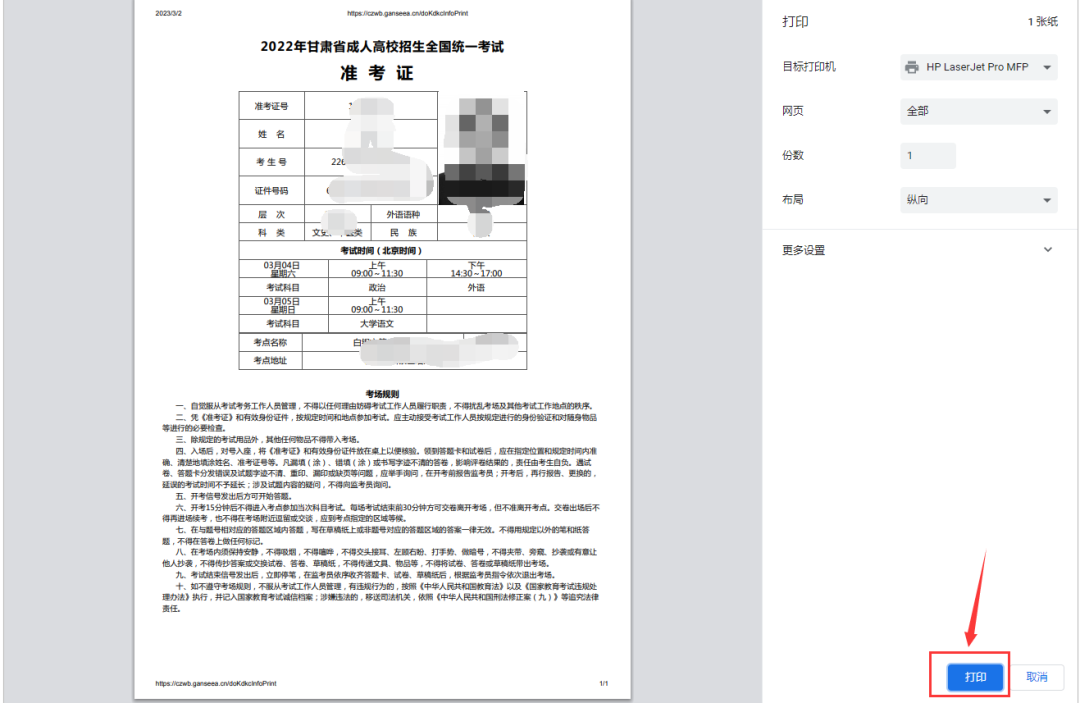 2022年甘肃省成人高考(延考)将于3月4日(星期六)、5日(星期日)进行,现将准考证打印事项通知如下: