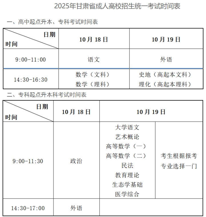 4、考试科目安排及考试时间表:此处一般是考生所报考层次各科目的考试时间。其中高中起点升本科的考生须参加4个科目的考试,其他层次的考生是参加3个科目的考试。