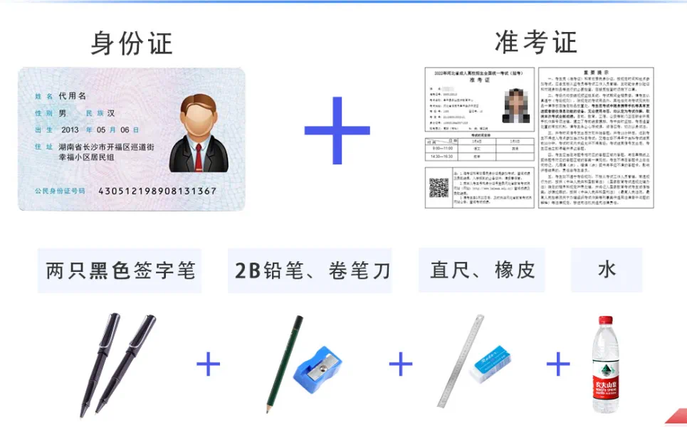 1、成人高考采用纸质试卷考试,请考生携带好考试工具提前一个小时到达考场。按照准考证上的考场编号找自己的考试教室。