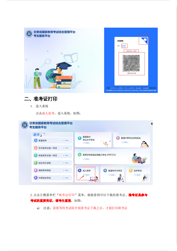 2025年甘肃省成人高考将于本周10月18日(星期六)-19日(星期日)进行,现将准考证打印事项通知如下: