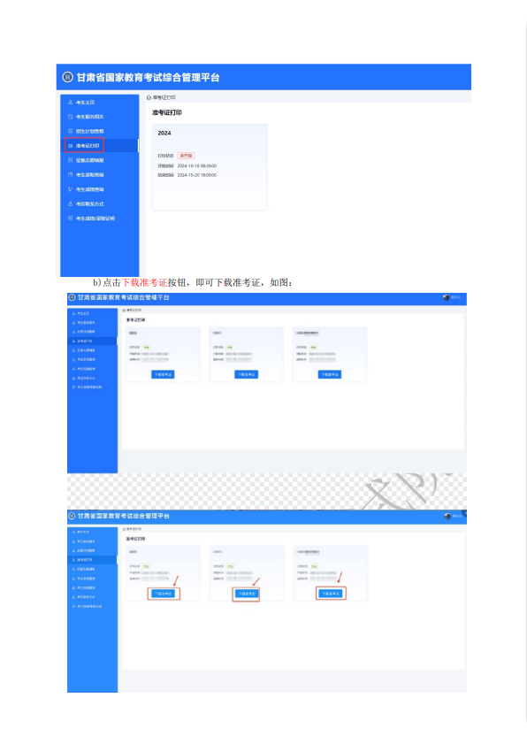 2.登录后点击【成人高考】,进入系统。点击左侧菜单栏“准考证打印”菜单,就能看到可以下载的准考证。点击【下载准考证】按钮,即可下载准考证。