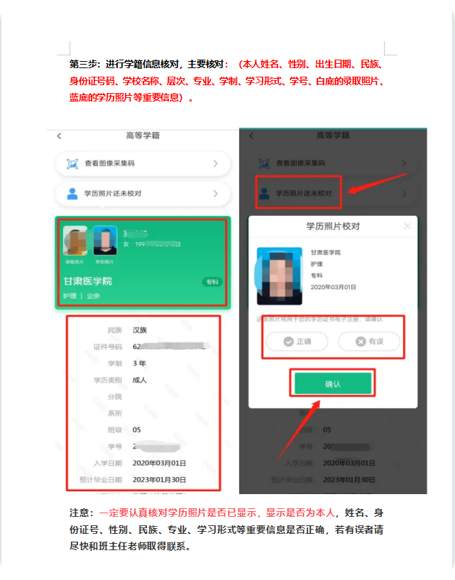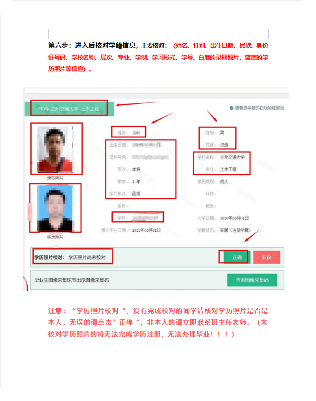 主要核对以下信息:姓名、性别、出生日期、民族、身份证号码、学校名称、层次、专业、学制、学习形式、学号、白底的录取照片、蓝底的学历照片等信息。同时请一定要完成学历照片校对,确认白底的录取照片和蓝底的学历照片是否是本人,若不是本人请反馈。