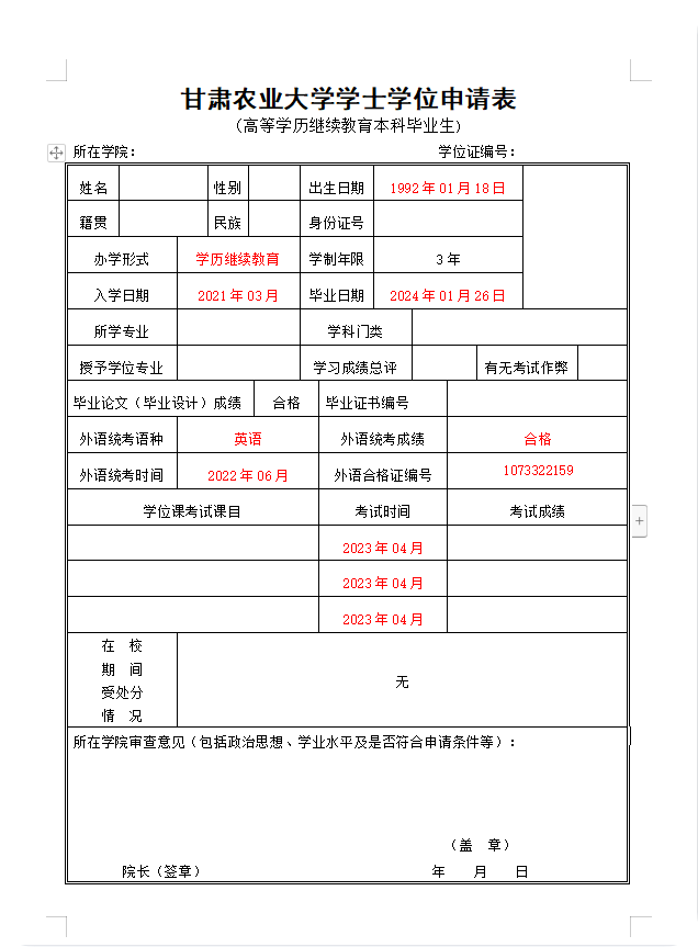 大家好,接甘肃农业大学通知,甘肃农业大学2025年12月申请学士学位工作现已开始,请达到申请条件的本科毕业生【参加学校组织的学位英语考试成绩合格(60分及以上),参加学校组织的3门学位课程考试,成绩均达到70分及以上。】抓紧时间提交以下材料: