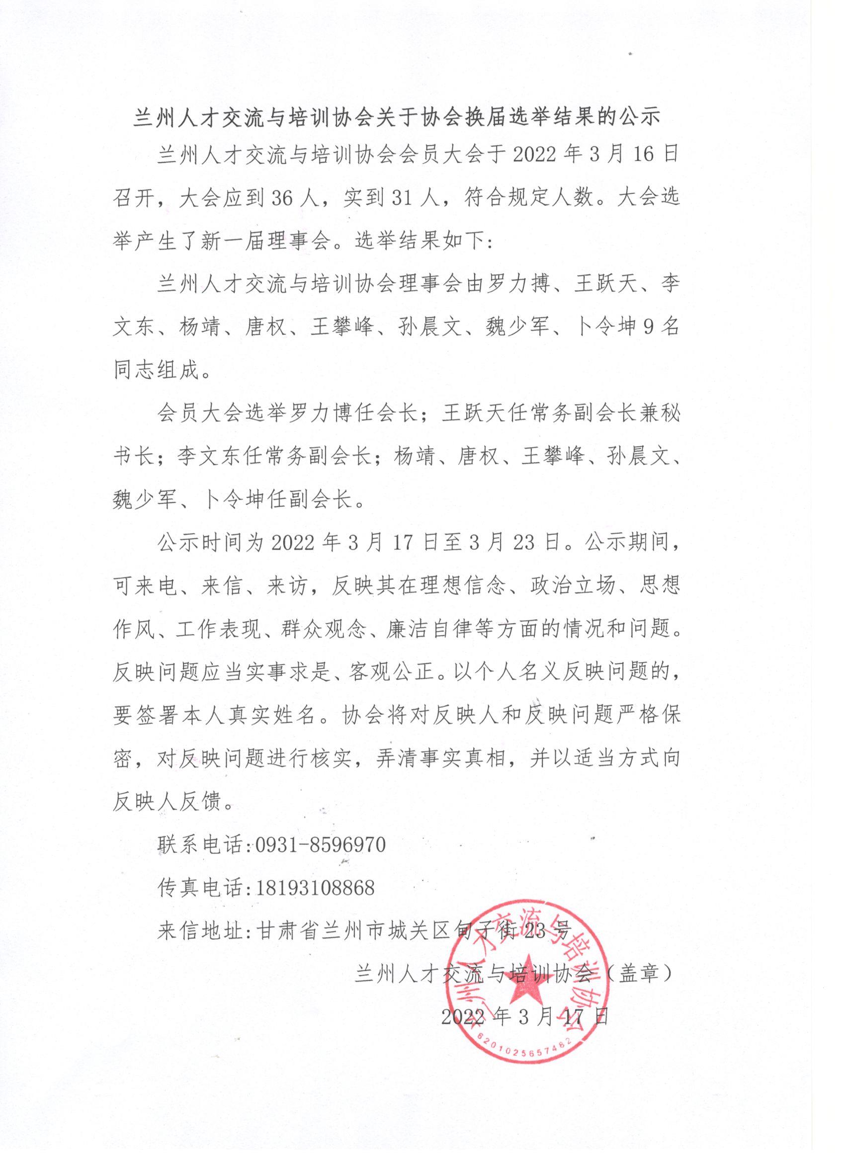 兰州人才交流与培训协会关于协会换届选举结果的公示
