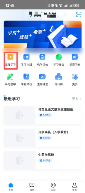登录电脑端平台后,首页显示每学期的课程,如没有当前学期课程,则学校还没有开课。点击“课程学习”进行学习;课程栏中“/”右侧表示需要完成的要求,左侧是实际完成的进度;“学习中”表示此门课程,本学期正在学习中或者为之前学期未通过的课程,课程通过显示已结束。线上考试,可在考试模块中参加。