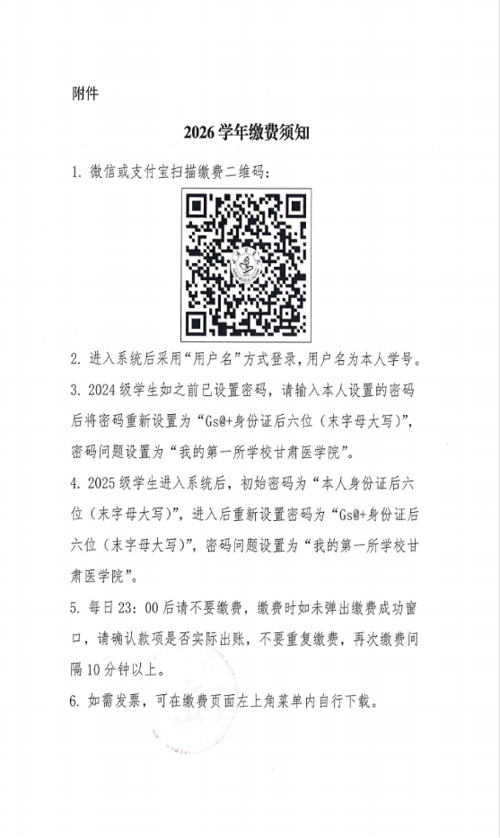 大家好,接甘肃医学院通知,甘肃医学院2024级、2025级学生即日起开始缴纳2026年度学费,现将具体缴费事宜通知如下,请各位同学认真阅读,按期完成。