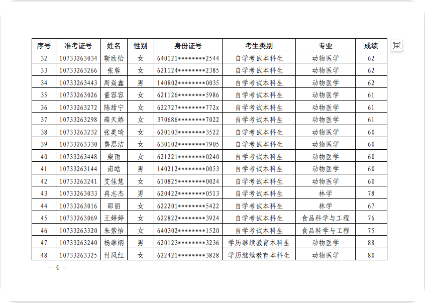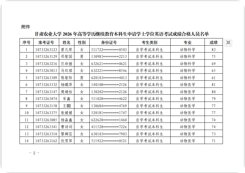 大家好,接甘肃农业大学通知,甘肃农业大学2026 年本科生学位外语考试成绩已出(考试时间:2026.3.21),考试成绩合格(60分及以上)的具体名单公布如下: